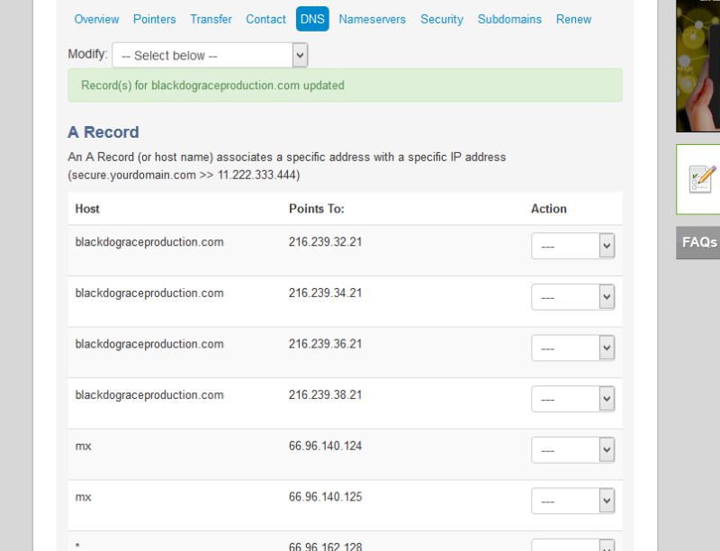 On your registrar, navigate to DNS (you’re already there), then select A Record from the drop down menu. Scroll down to the bottom of the A Record and enter (Host) your domain name without the “www.” Under Points To, enter the IP addresses shown above (all four of them). These IP addresses are also on the Setting Instructions (see below).