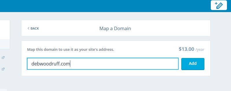 In your WordPress dashboard select Domain (at the bottom of the list, it wouldn’t fit in the screenshot). As you can see, you can purchase a domain and the mapping through WordPress (it doesn’t show debwoodruff.com because it is (obviously) not available. The $25 is for the domain itself and the first year of mapping. If you already have a domain, click Map It.